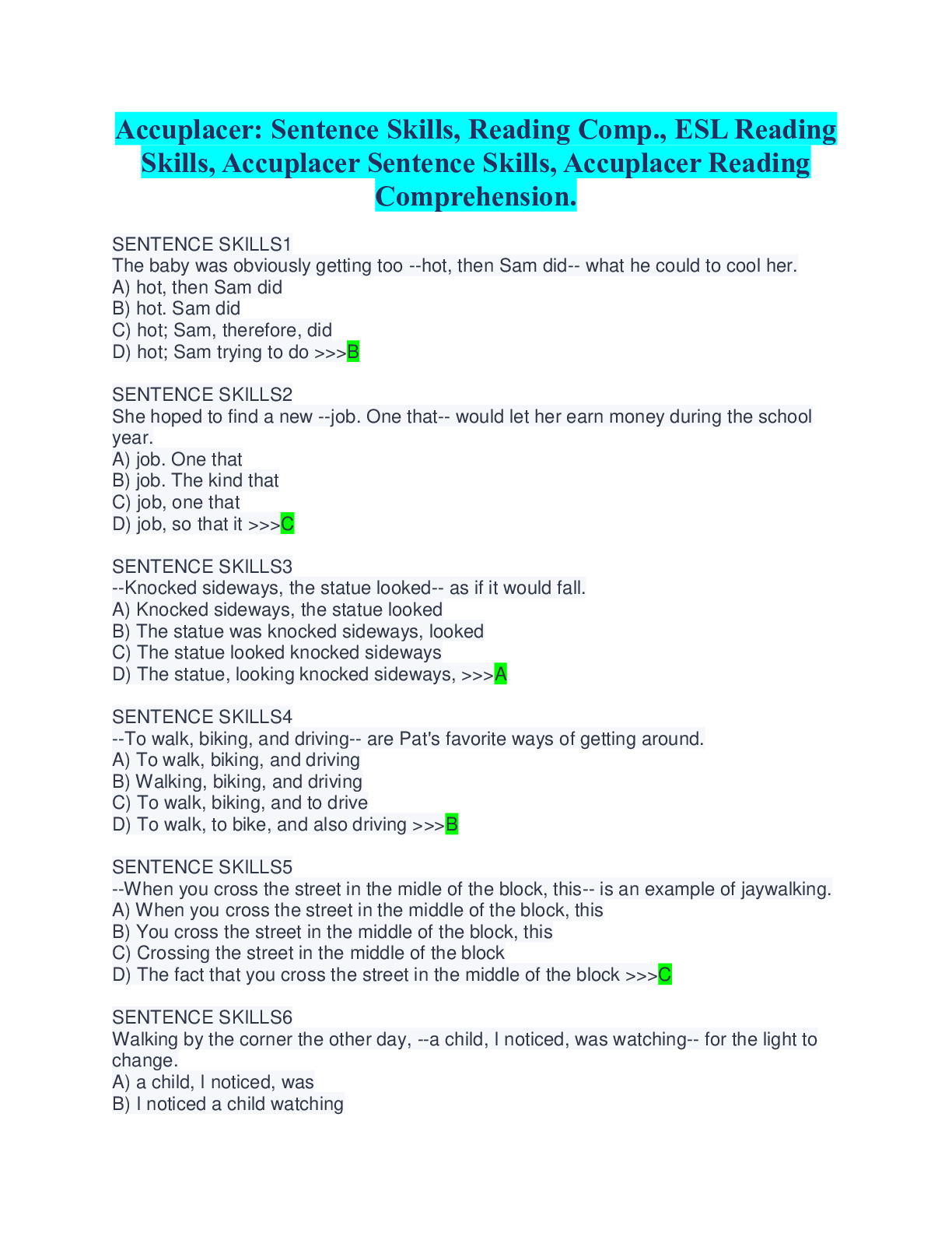 Physics > QUESTIONS & ANSWERS > Accuplacer: Sentence Skills, Reading Comp., ESL Reading Skills, Accuplacer Sentence Skills, Accuplacer Reading Comprehension. SENTENCE SKILLS1 (All)