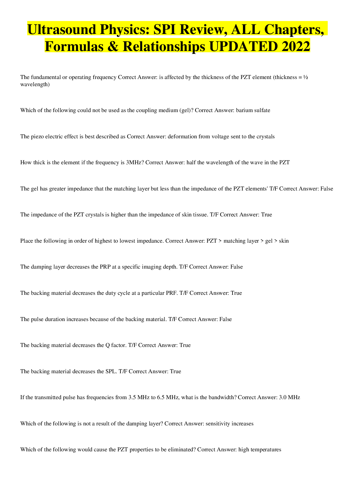 Physics > QUESTIONS & ANSWERS > Ultrasound Physics Review|SPI Review\ALL Chapters, Formulas & Relationships|UPDATED 2022 (All)
