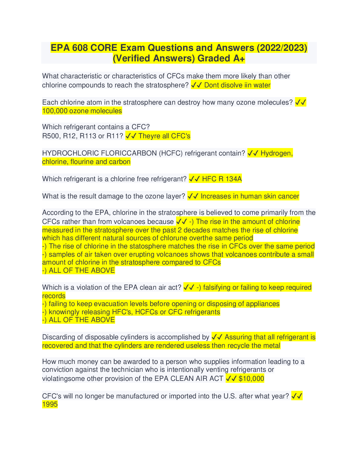 Physics > QUESTIONS & ANSWERS > EPA 608 CORE Exam Questions and Answers (2022/2023) (Verified Answers) Graded A+ (All)