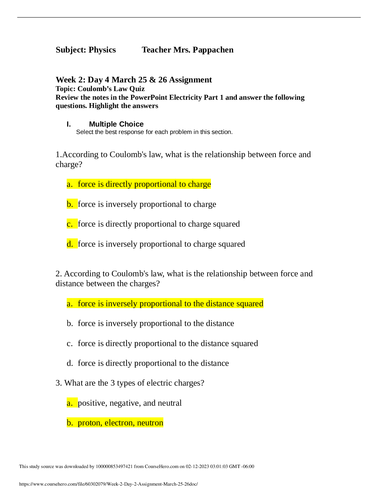 Physics > QUESTIONS & ANSWERS > Week_2_Day_2__Assignment_March_25_26 | Download for quality grades | 100% solved quiz | (All)