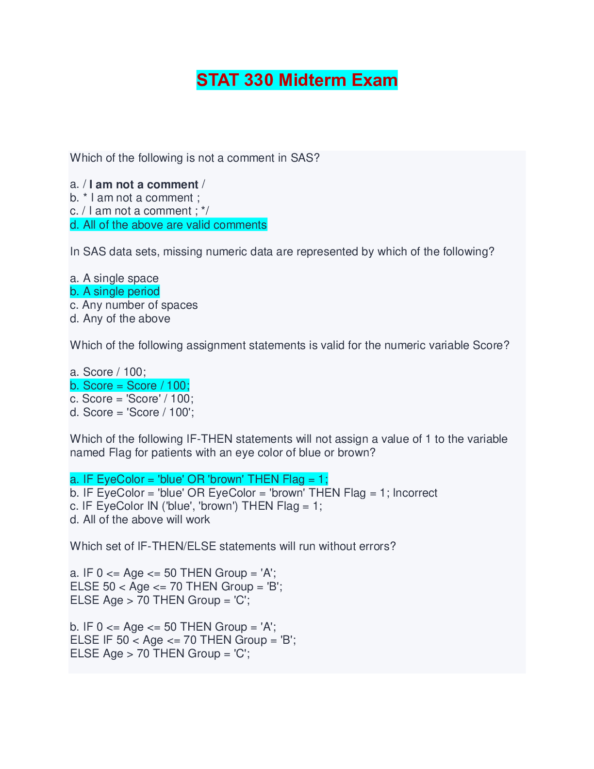 Statistics > EXAM > STAT 330 Midterm Exam | Questions with 100% Correct Answers (All)