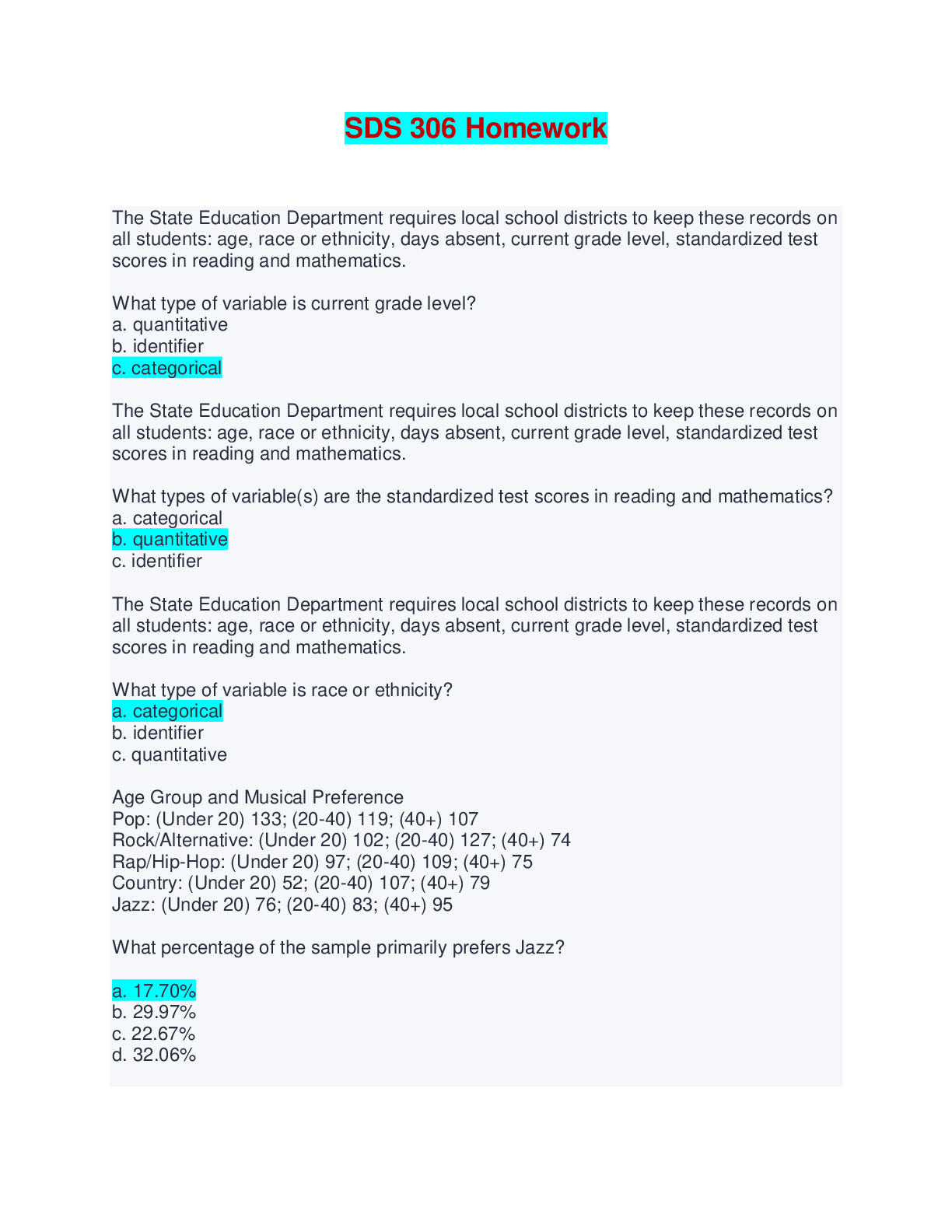 Statistics > EXAM > SDS 306 Homework | Questions with Verified Answers (All)