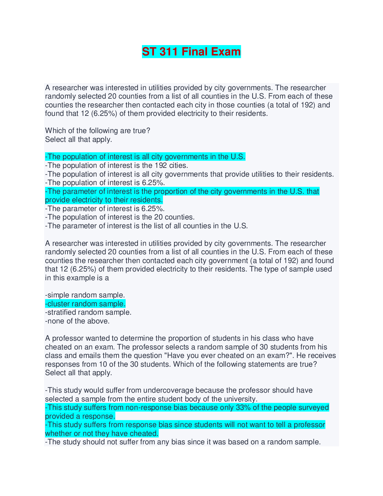 Statistics > EXAM > ST 311 Final Exam | Questions and Answers (Complete Solutions) (All)