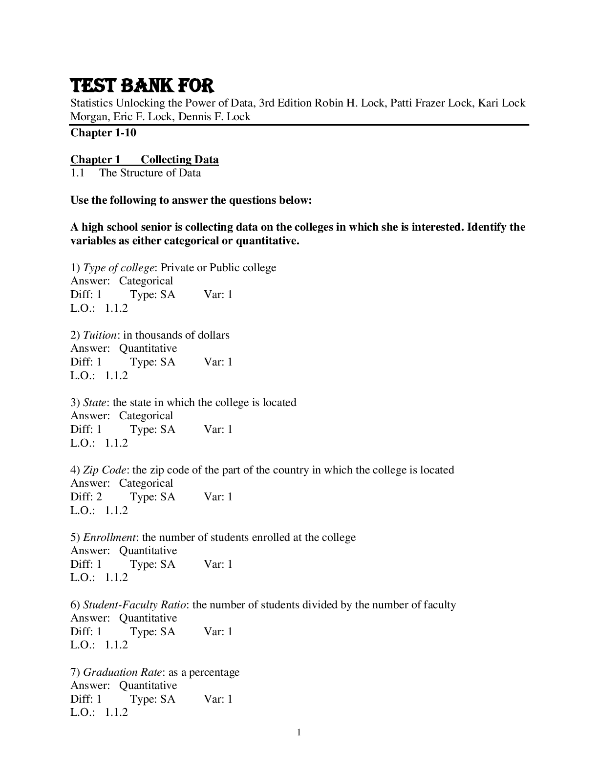 Statistics > EXAM > Test Bank For Statistics Unlocking the Power of Data, 3rd Edition Robin H. Lock, Patti Frazer Lock, Kari Lock Morgan, Eric F. Lock, Dennis F. Lock Chapter 1-10 (All)