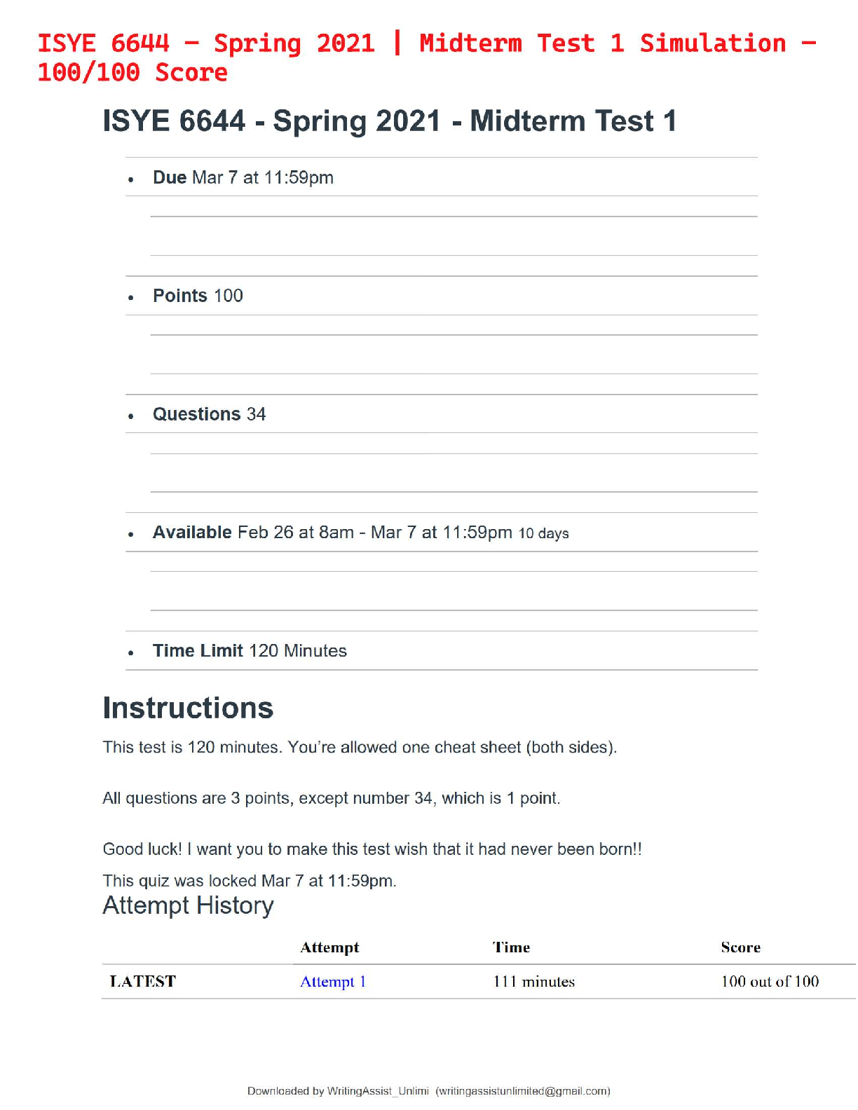 Statistics > EXAM > ISYE 6644 Exam 1 | Score 100/100 | Georgia Institute of Technology (All)