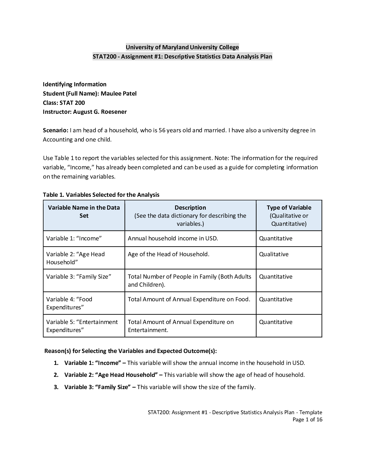 Statistics > STUDY GUIDE > STAT 200 Patel Maulee - Assignment #1_ Descriptive Statistics Data Analysis Plan University of Maryland (All)