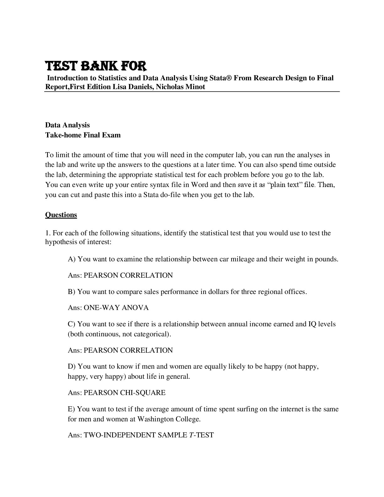 Statistics > TEST BANKS > Test Bank For An Introduction to Statistics and Data Analysis Using Stata® From Research Design to Final Report,First Edition By Lisa Daniels, Nicholas Minot (All)