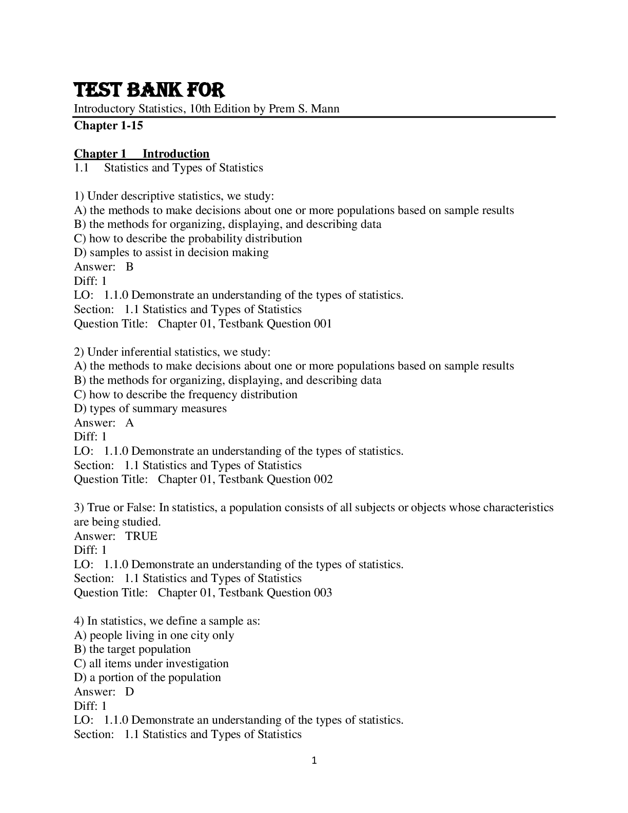 Statistics > TEST BANKS > Test Bank For Introductory Statistics, 10th Edition by Prem S. Mann Chapter 1-15 (All)