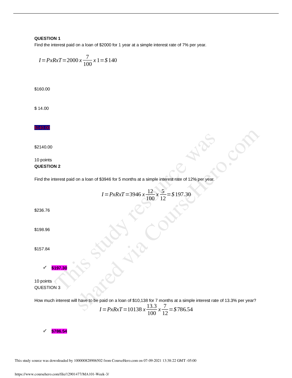 Statistics > EXAMs > MA101 Week 3 Questions and Answers Quiz (All)