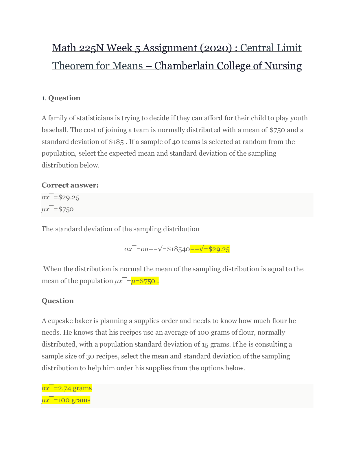 Statistics > EXAMs > Math 225N Week 5 Assignment_2020 {Graded A} | Central Limit Theorem for Means – Chamberlain College of Nursing (All)