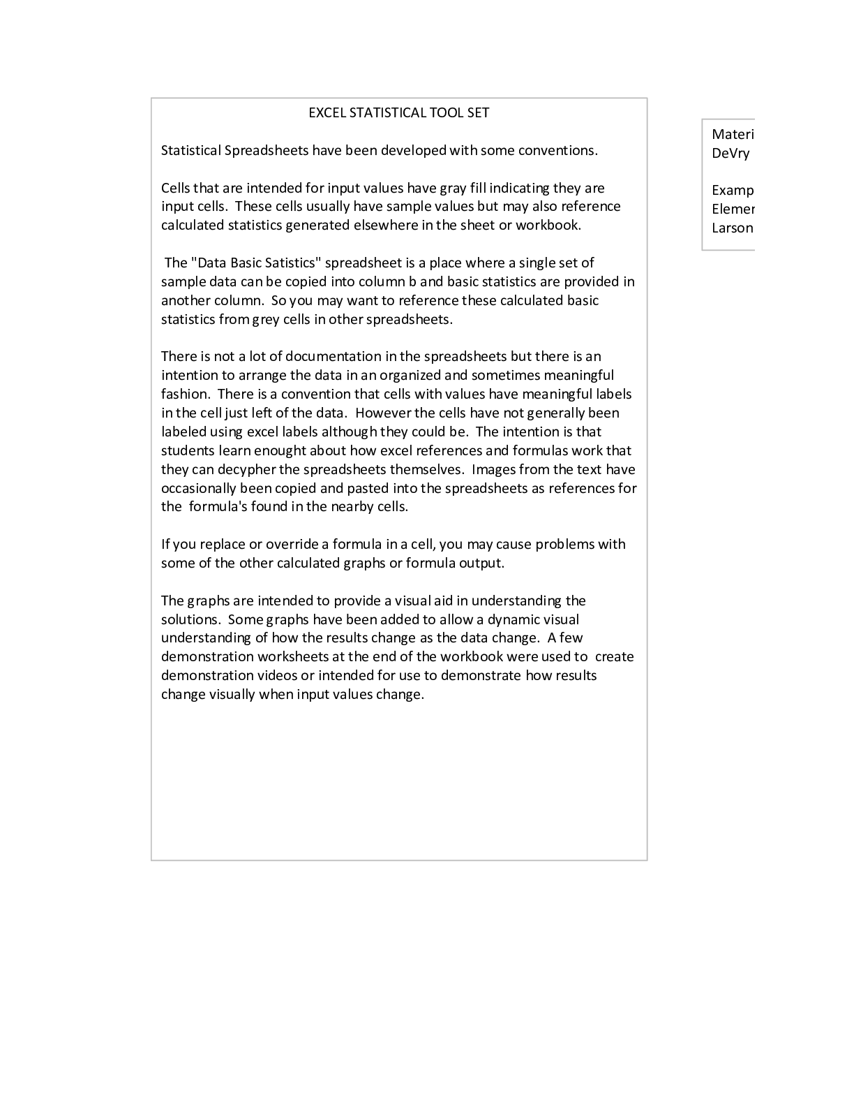 Statistics > STUDY GUIDE > MATH 399N/Math 399N Excel Statistical Toolkit r3 v9 (Devry) (All)
