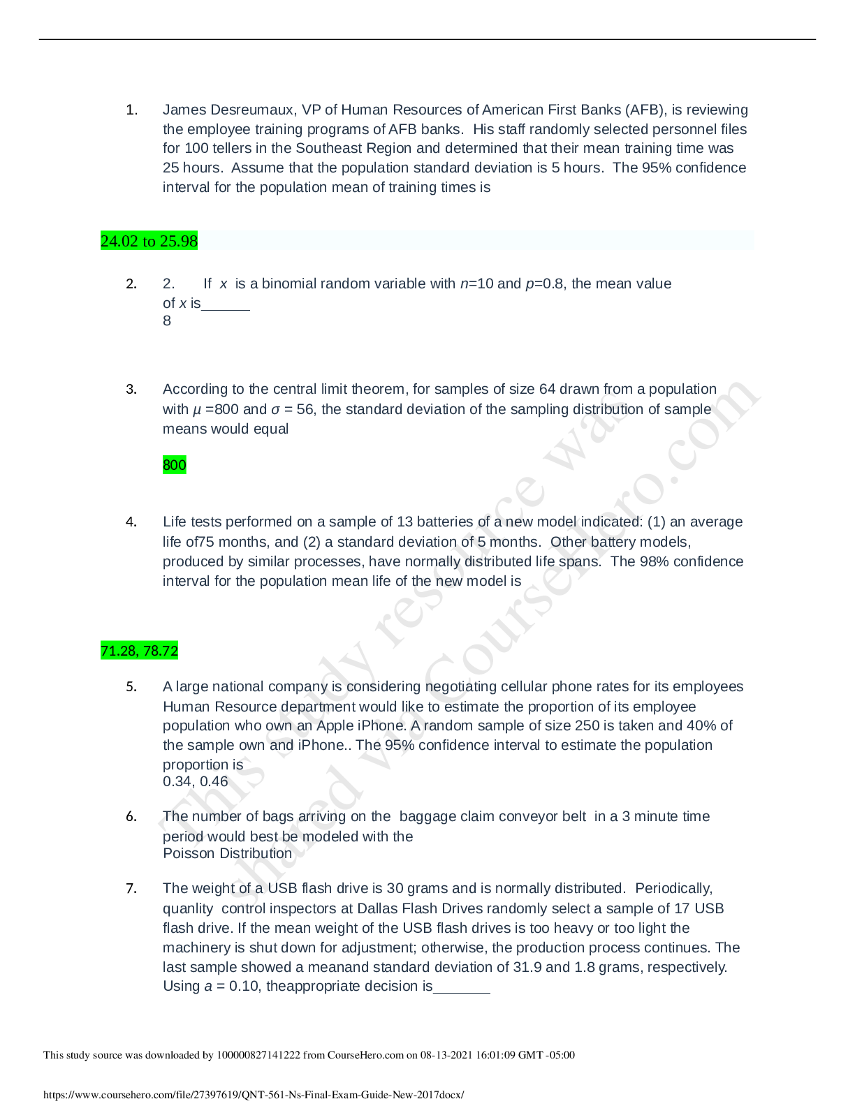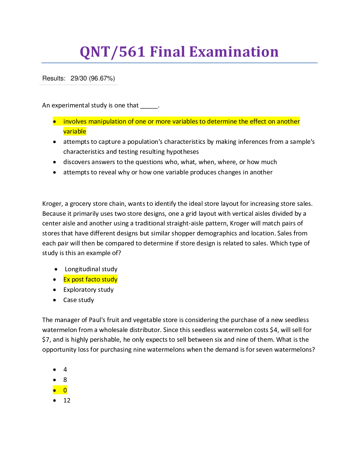 Statistics > QUESTIONS & ANSWERS > University of Phoenix: QNT 561 FINAL EXAM. All Answers Highlighted. (All)