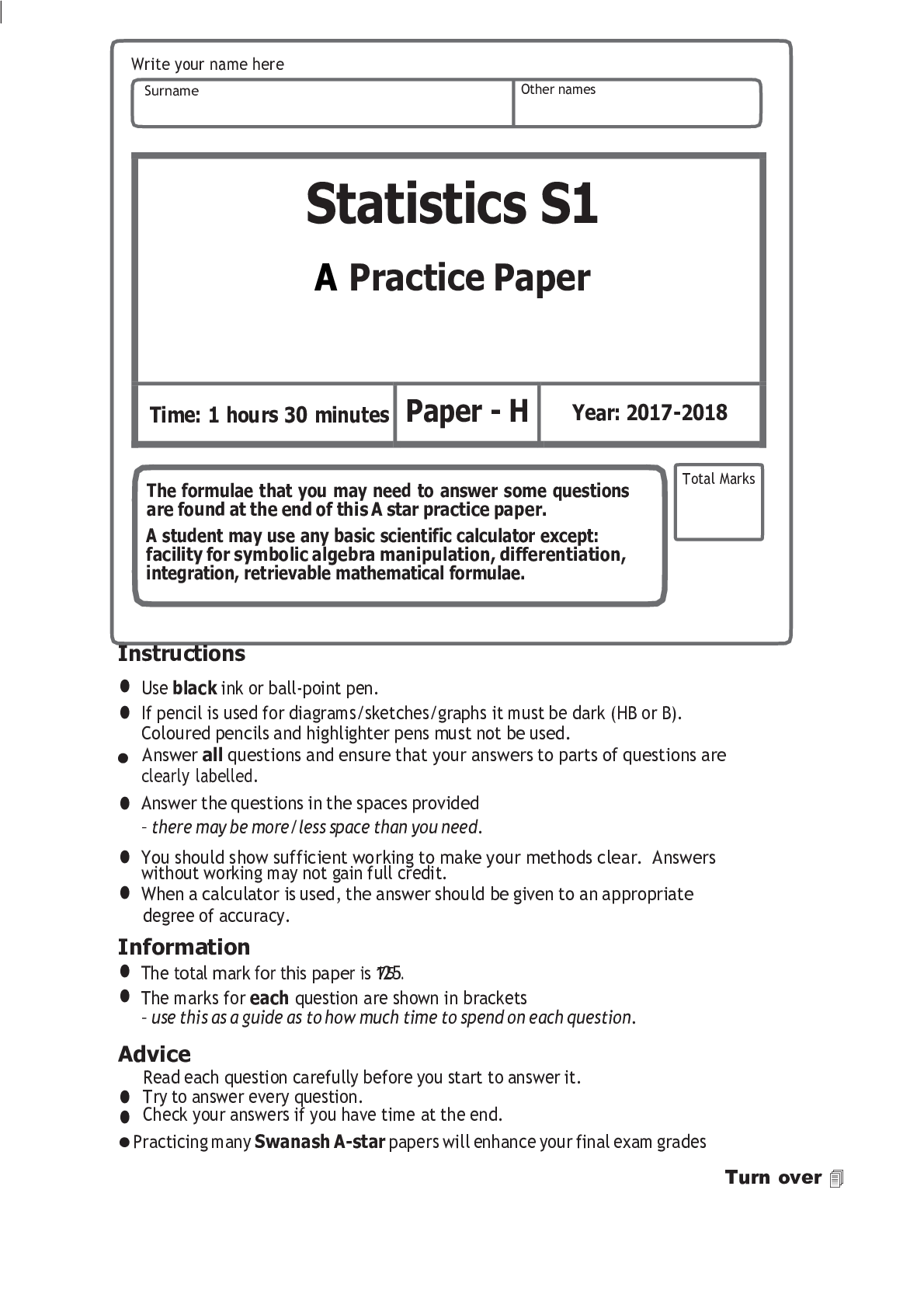 Statistics > EXAM > Statistics S1 A Practice Paper questions only (All)