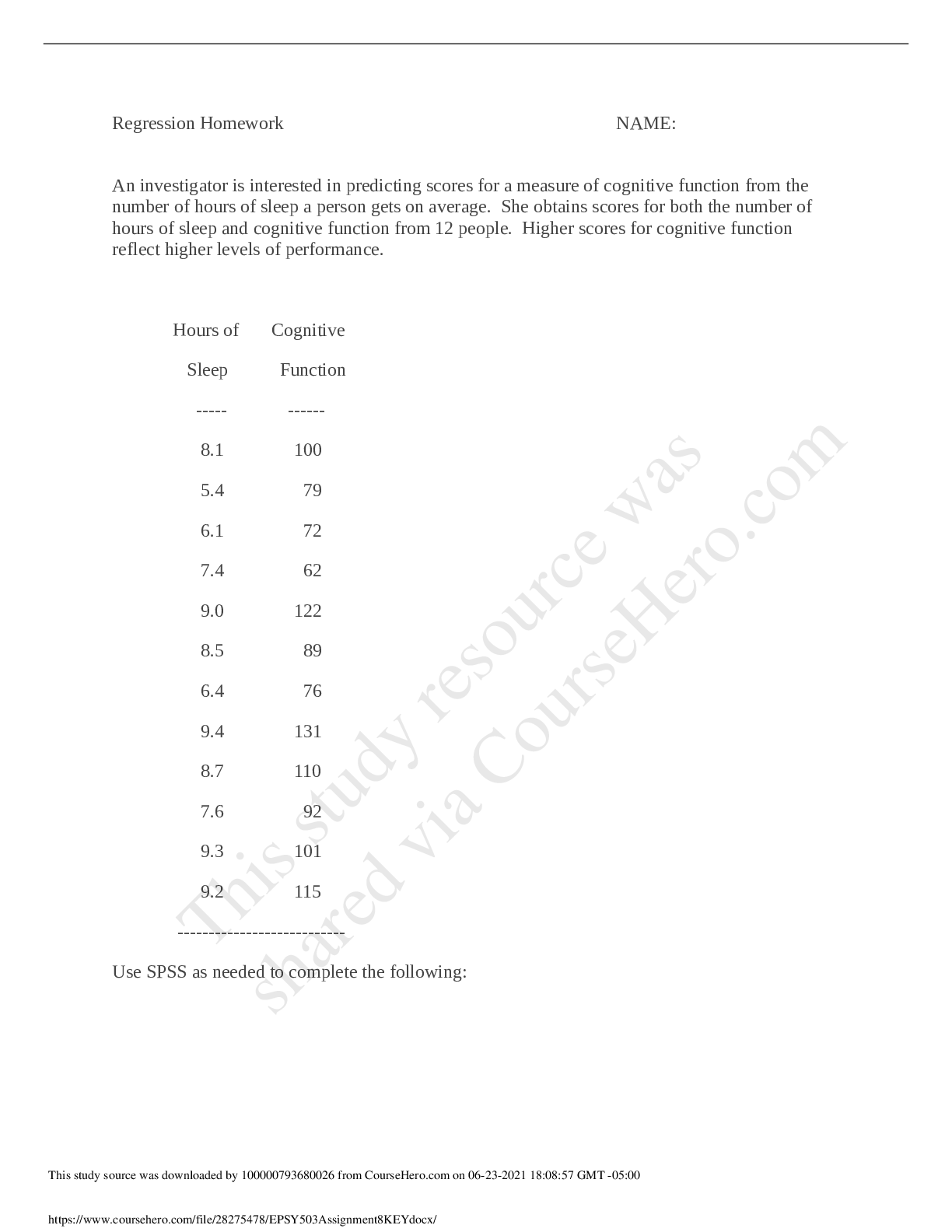 Statistics > QUESTIONS & ANSWERS > University of Illinois, ChicagoEPSY 503EPSY503Assignment8KEY Regression Homework (All)