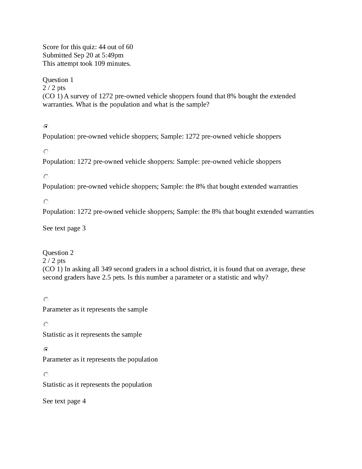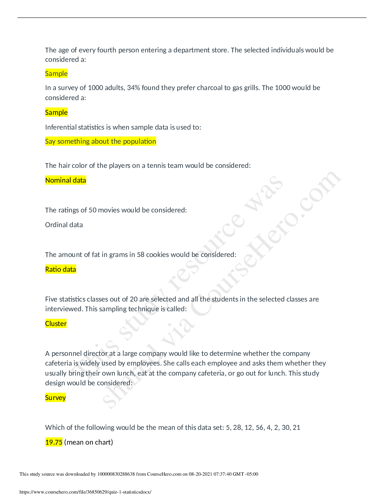 Statistics > QUESTIONS & ANSWERS > Quiz Submissions - Week 1: Quiz 1 - STAT 200 6372 Introduction to Statistics (2202) / STAT 200 week 1 quiz 1 (2021) (All)