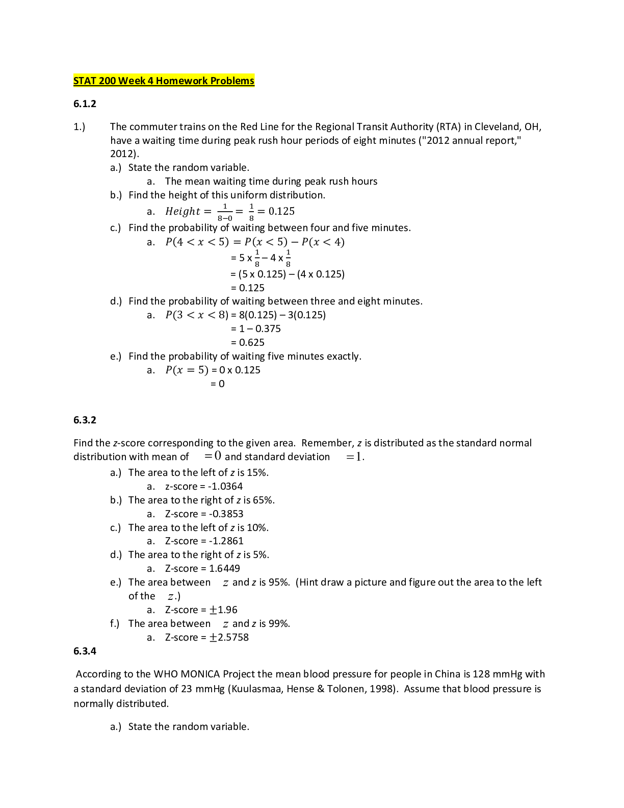Statistics > STUDY GUIDE > STAT 200 Week 6 Homework Problems, full solution guide, 100% correct. (All)