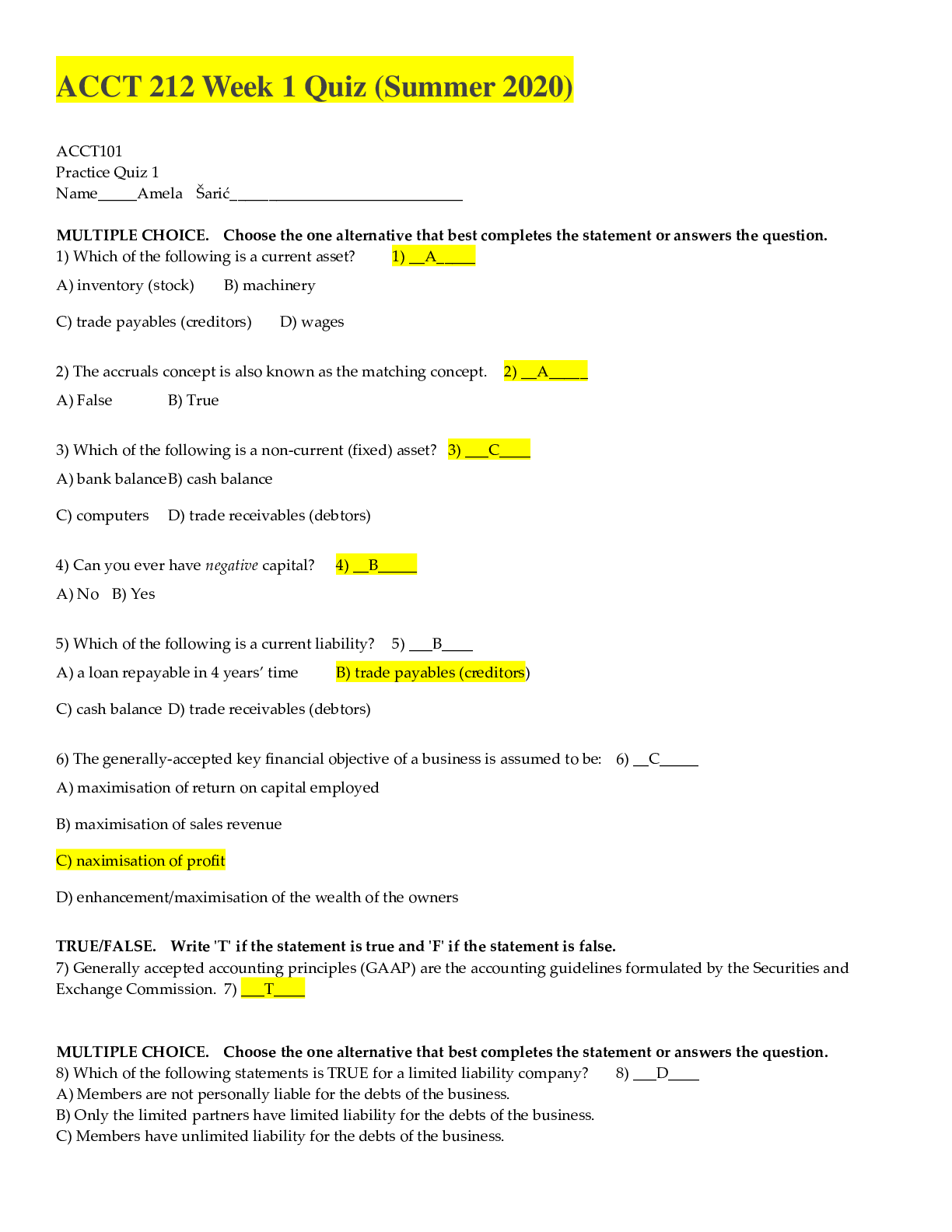 Accounting > EXAM > ACCT 212 Week 1 Quiz (Summer 2020)/(Download To Score An A) (All)