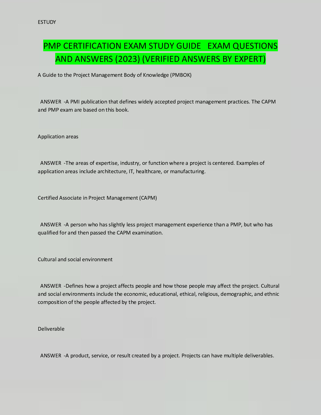 Project Management > EXAM > PMP CERTIFICATION EXAM STUDY GUIDE EXAM QUESTIONS AND ANSWERS (2023) (VERIFIED ANSWERS BY EXPERT) (All)