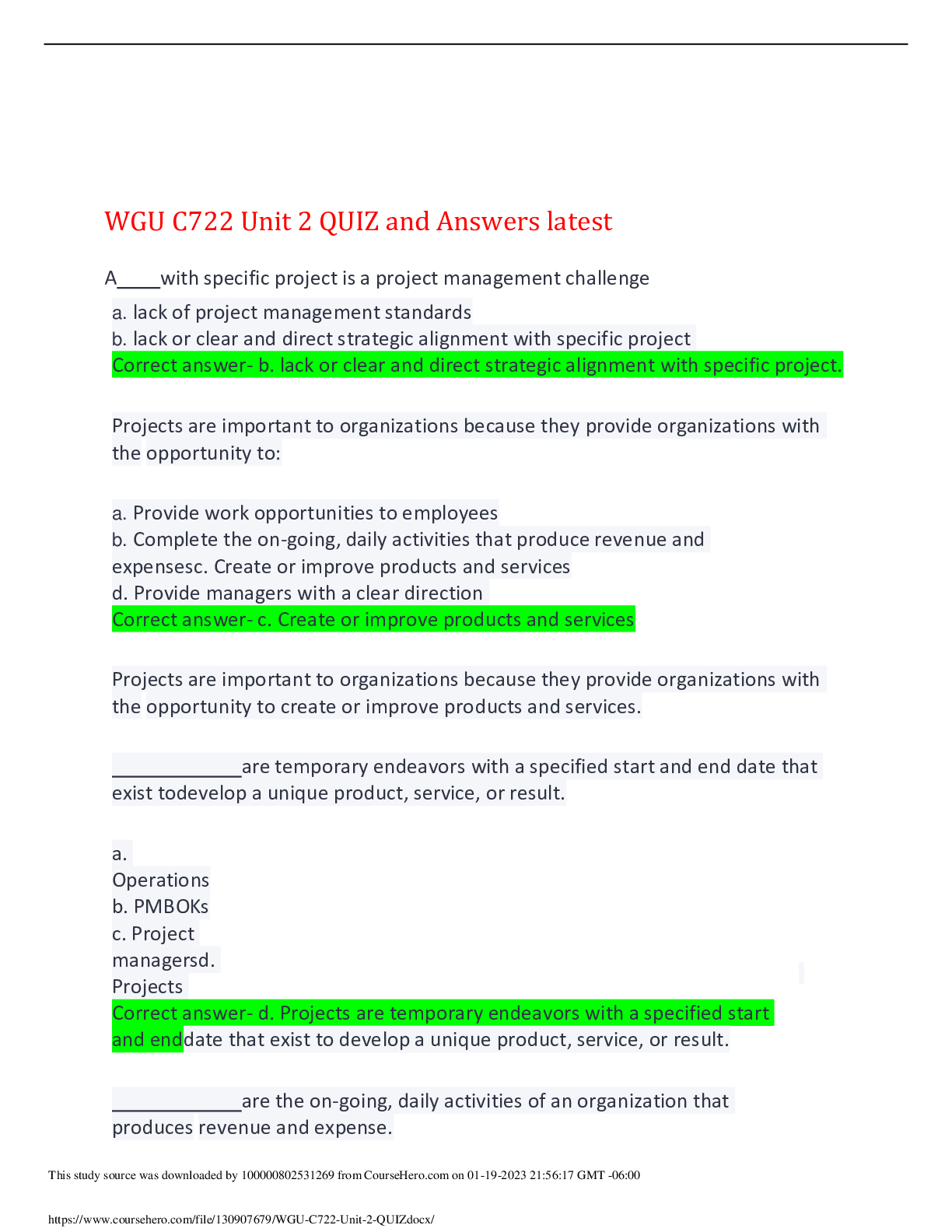 Project Management > EXAM > WGU C722 Unit 2 QUIZ and Answers latest,100% CORRECT (All)