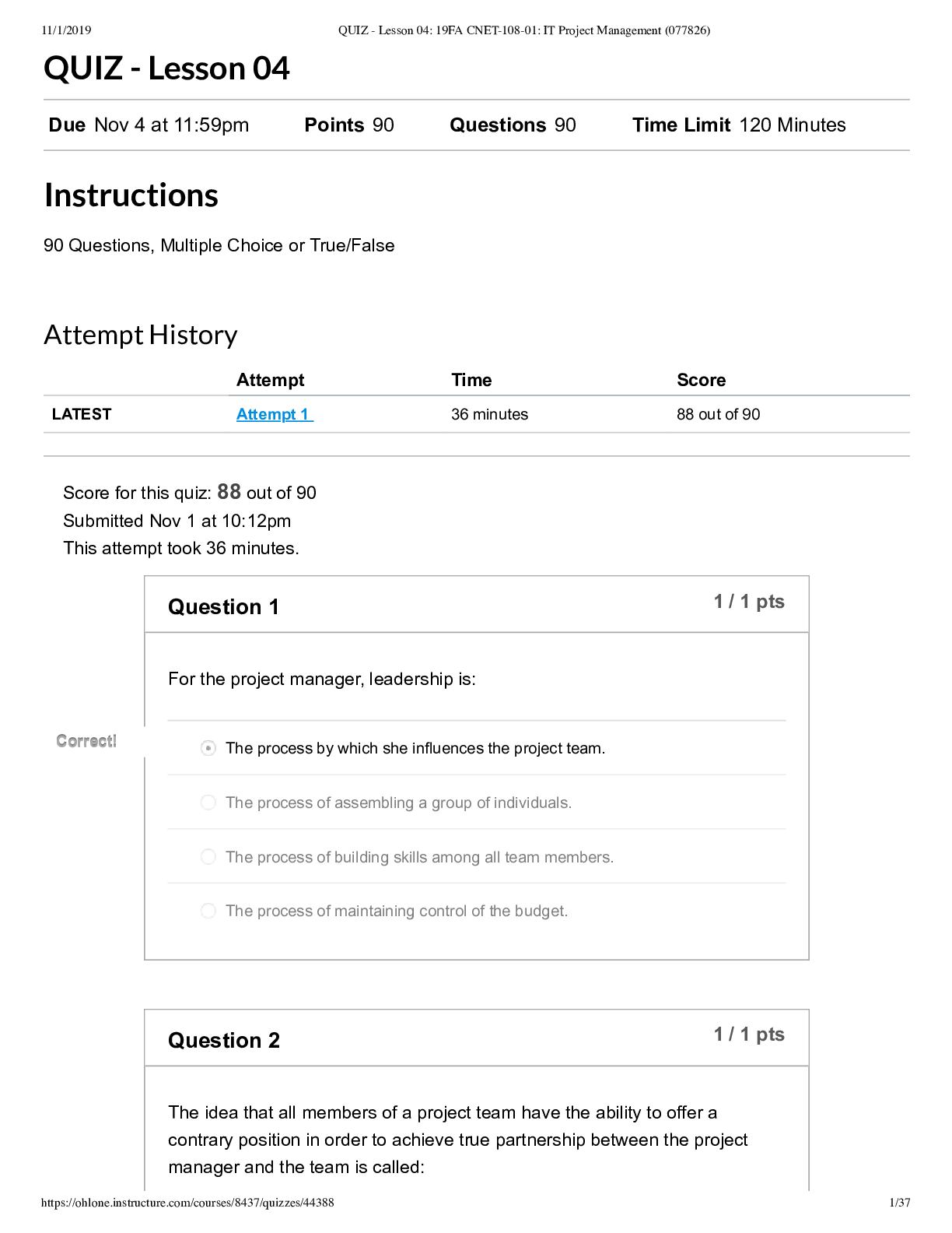 Project Management > QUESTIONS & ANSWERS > Questions and Answers > QUIZ - Lesson 04: 19FA CNET-108-01: IT Project Management (077826). Score for this quiz: 88 out of 90. (All)