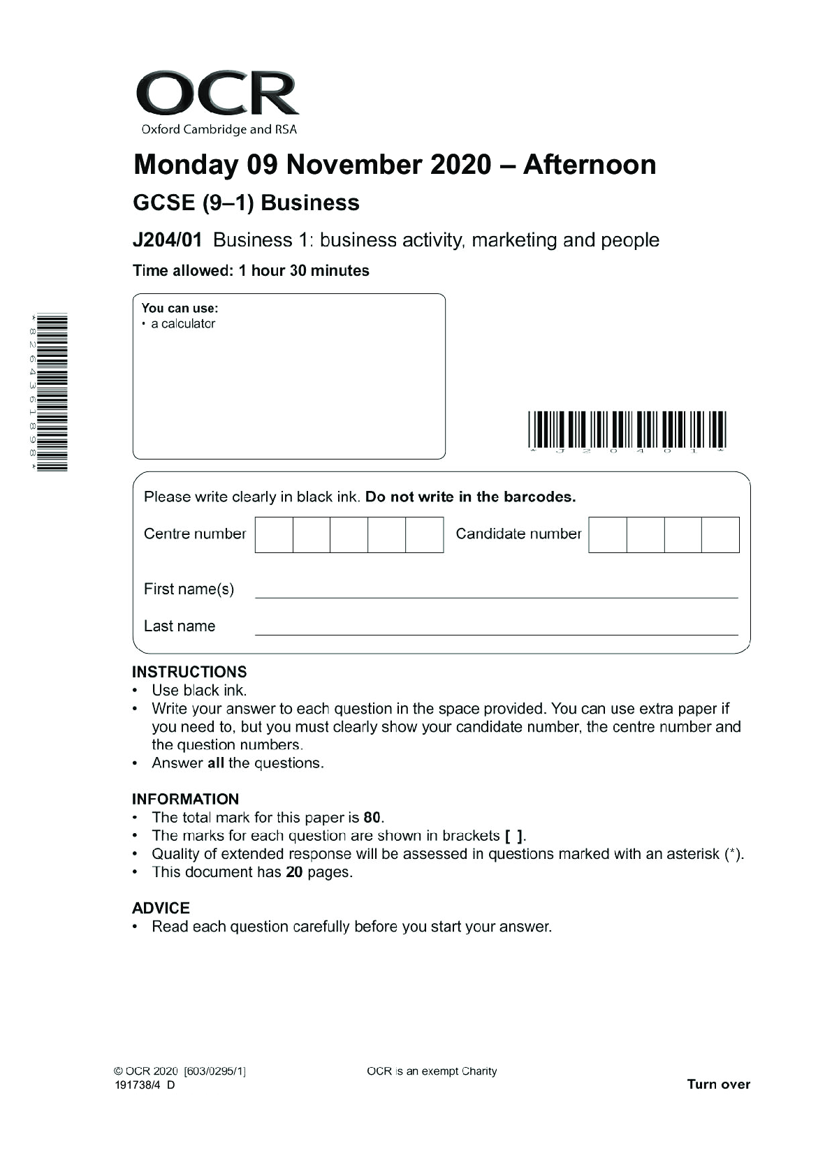 Business > AS Level Question Paper > Business J204/01: Business 1: business activity, marketing and people General Certificate of Secondary Education QUESTION PAPER for November 2020 (All)
