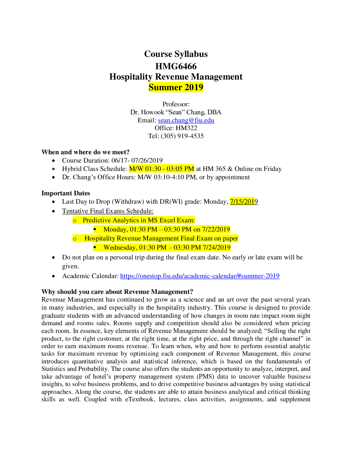 Business > LECTURE SLIDES/NOTES > HMG6466 Summer2019 Syllabus Hospitality Revenue Management-1 (All)