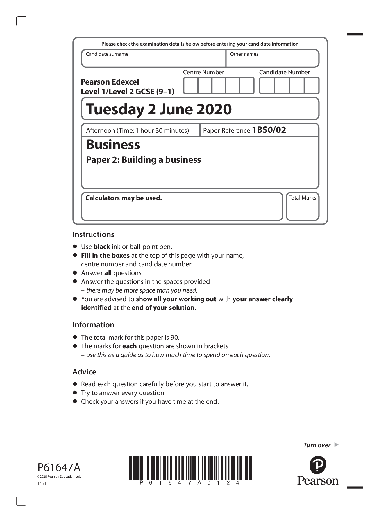 Business > GCSE QUESTION PAPER > Pearson Edexcel_GCSE (9–1) Business_1BS0/02 Question Paper_2020 | Paper 2: Building a business (All)