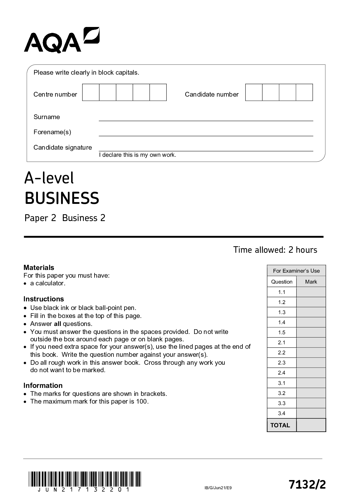 Business > AQA Question Papers > AQA A-level BUSINESS 7132/2 Paper 2 Business 2 Question Paper June 2021 (All)