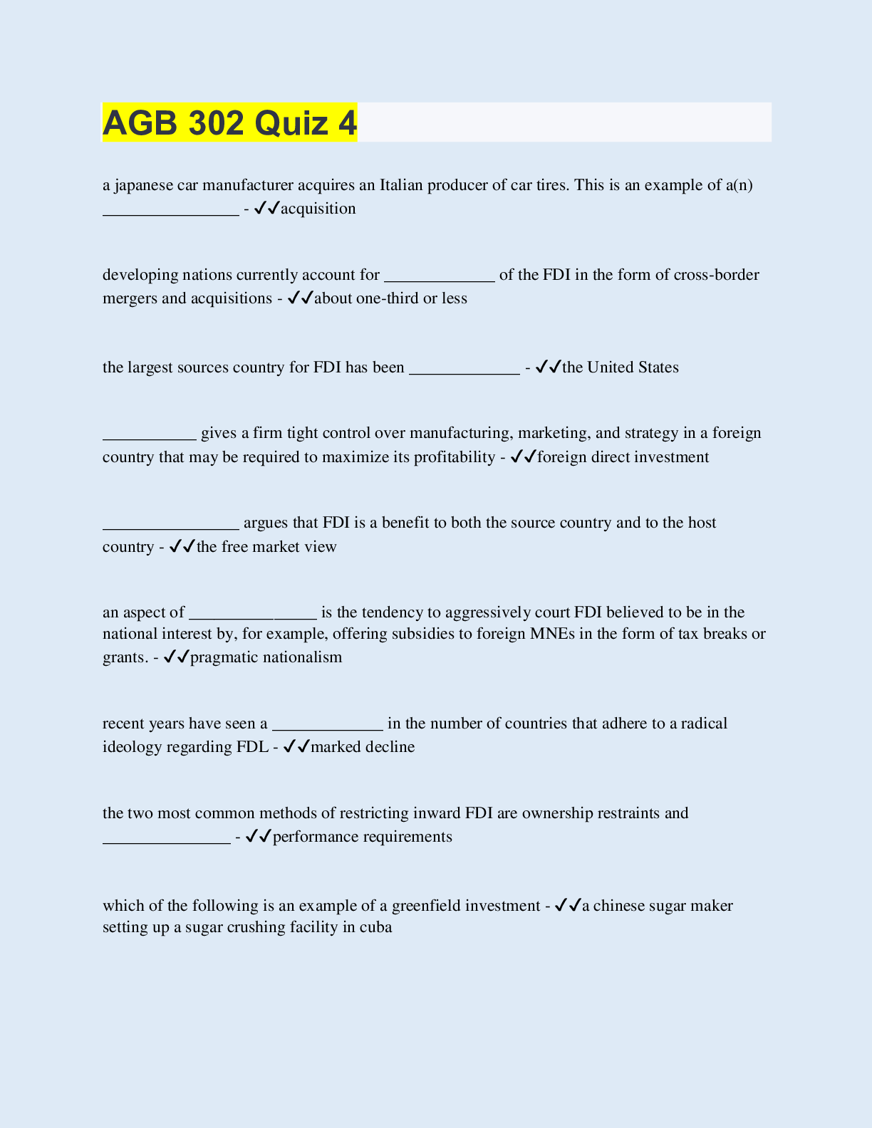 Business > Quiz > AGB 302 Quiz 4 | Questions with 100% Correct Answers | Updated & Verified (All)