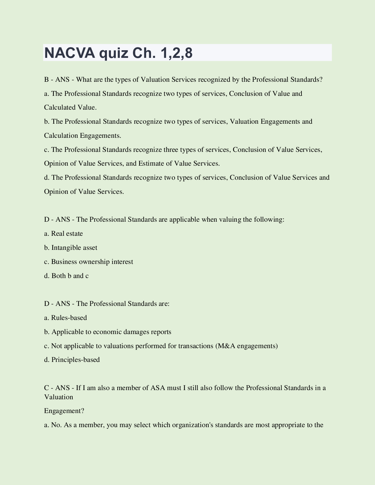 Business > Quiz > NACVA quiz Ch. 1,2,8 | Questions with 100% Correct Answers | Updated & Verified (All)