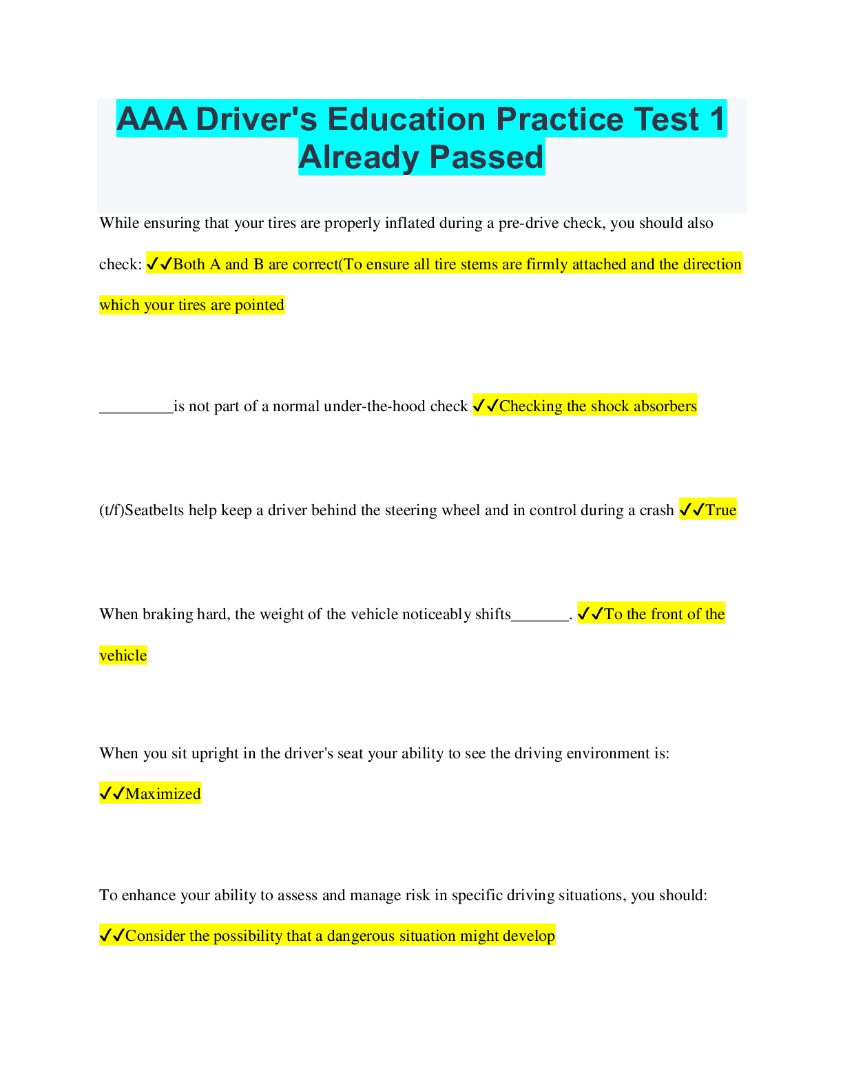 Cummunity Policing > EXAM > AAA Driver's Education Practice Test 1 Already Passed (All)