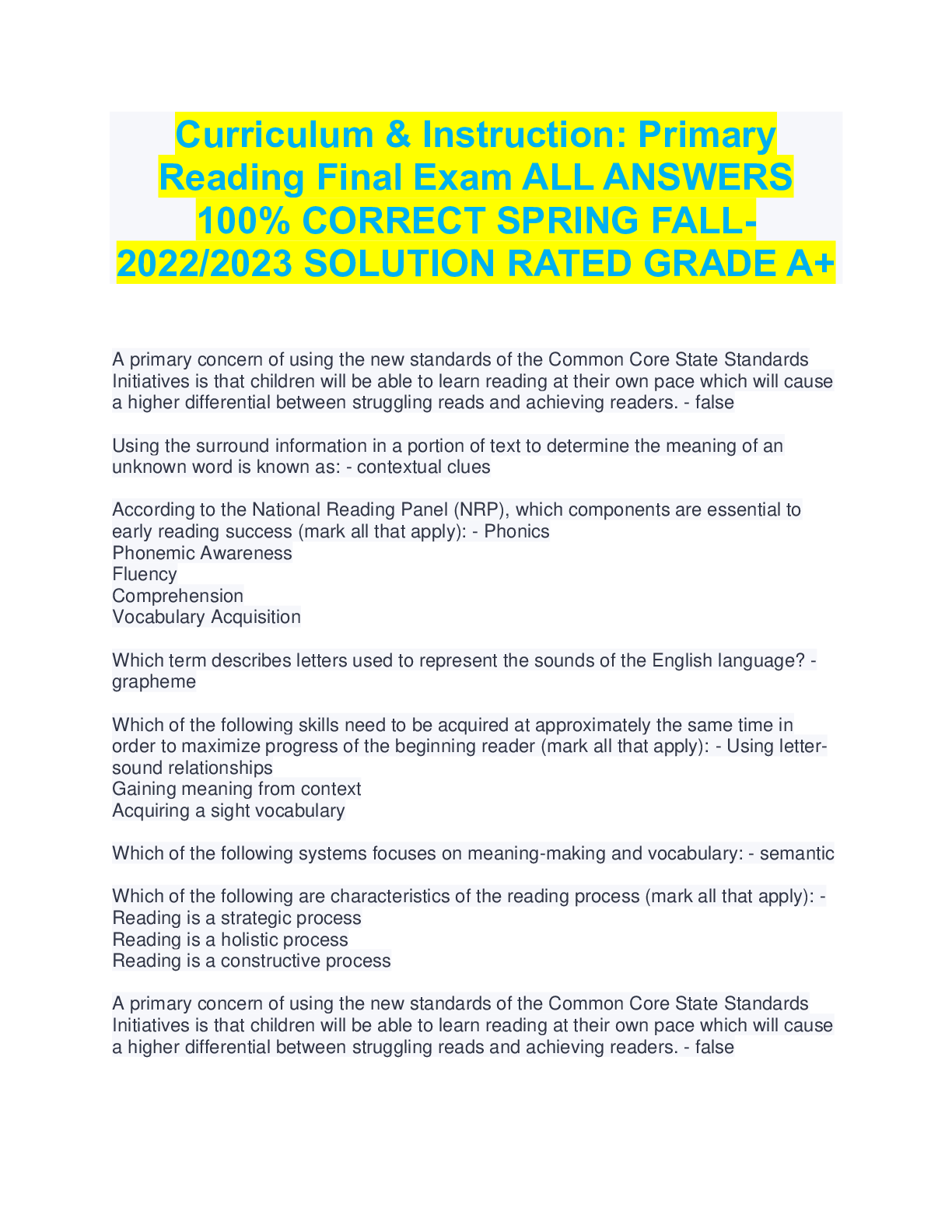 Cummunity Policing > EXAM > Curriculum & Instruction: Primary Reading Final Exam ALL ANSWERS 100% CORRECT SPRING FALL- 2022/2023 SOLUTION RATED GRADE A+ (All)