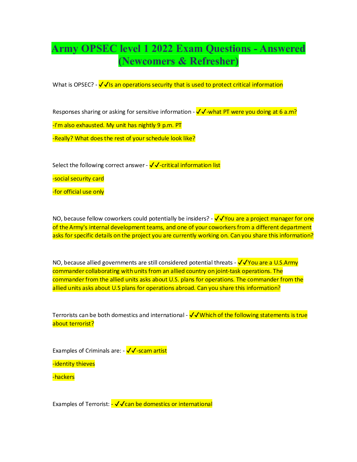 Military Science > AQA > rmy OPSEC level 1 2022 Exam Questions - Answered (Newcomers & Refresher) (All)