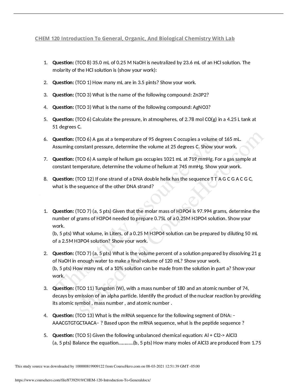 Chemistry > QUESTION PAPER (QP) > CHEM 120 Introduction To General, Organic, And Biological Chemistry With Lab (latest update 2021) (All)