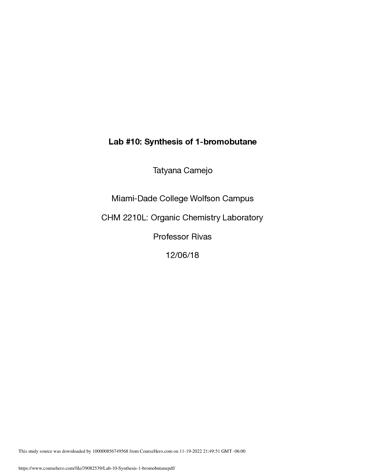 Chemistry > Lab Report > Lab 10 - Synthesis 1-bromobutane Miami Dade College, Miami CHM 2210L (All)