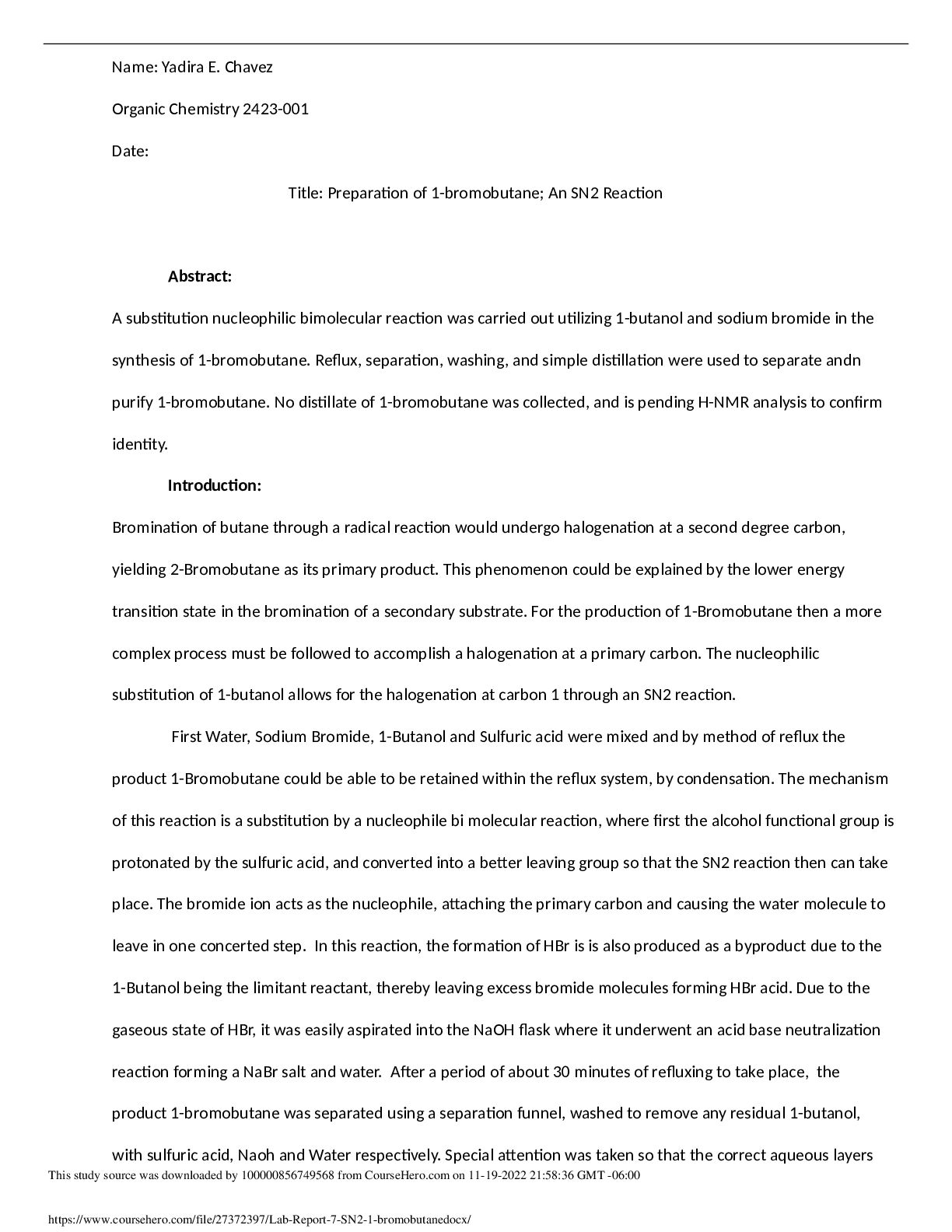 Chemistry > Lab Report > Lab Report #7 SN2 1-bromobutane San Antonio College CHEM 2423 (All)