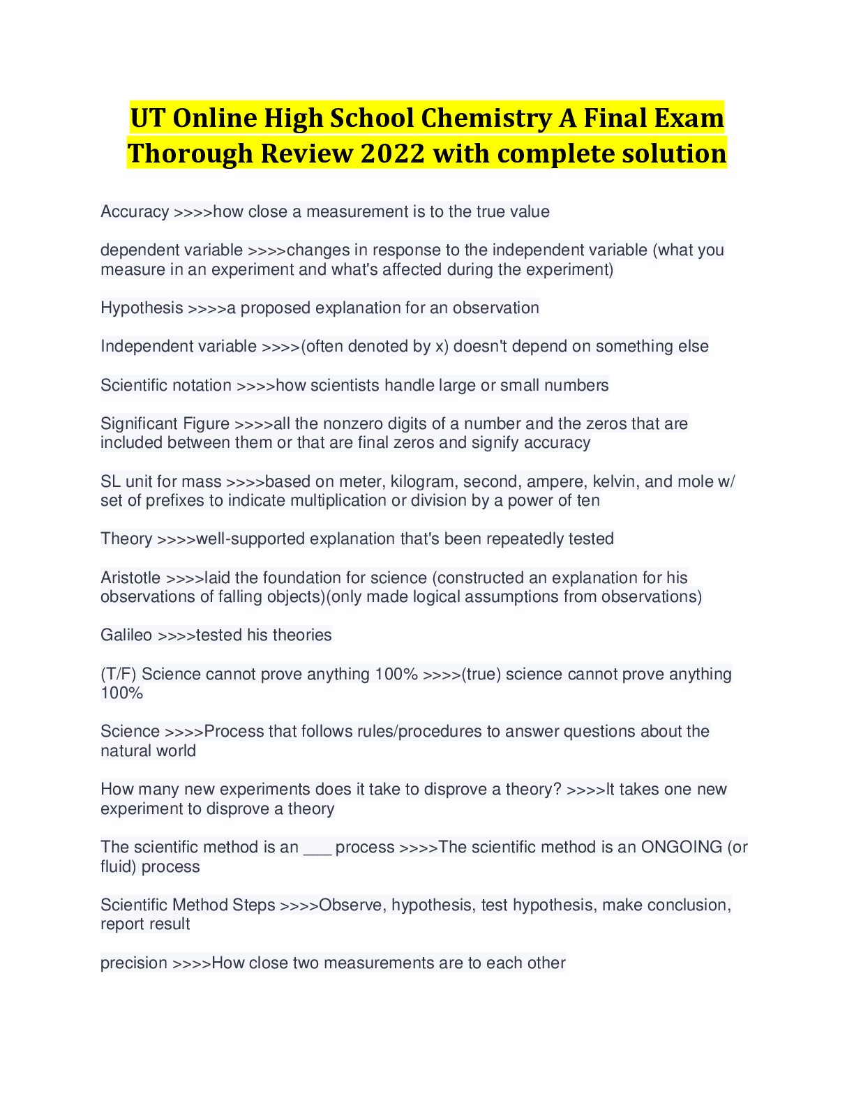 Chemistry > QUESTIONS & ANSWERS > UT Online High School Chemistry A Final Exam Thorough Review 2022 with complete solution (All)