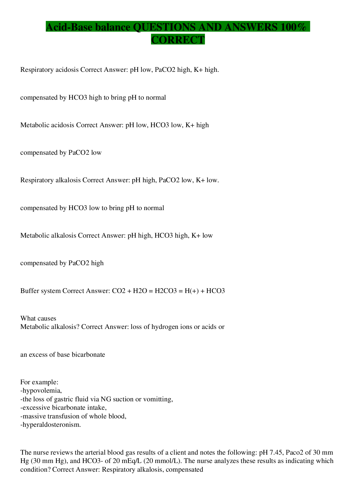 Chemistry > QUESTIONS & ANSWERS > Acid-Base balance QUESTIONS AND ANSWERS 100% CORRECT (All)