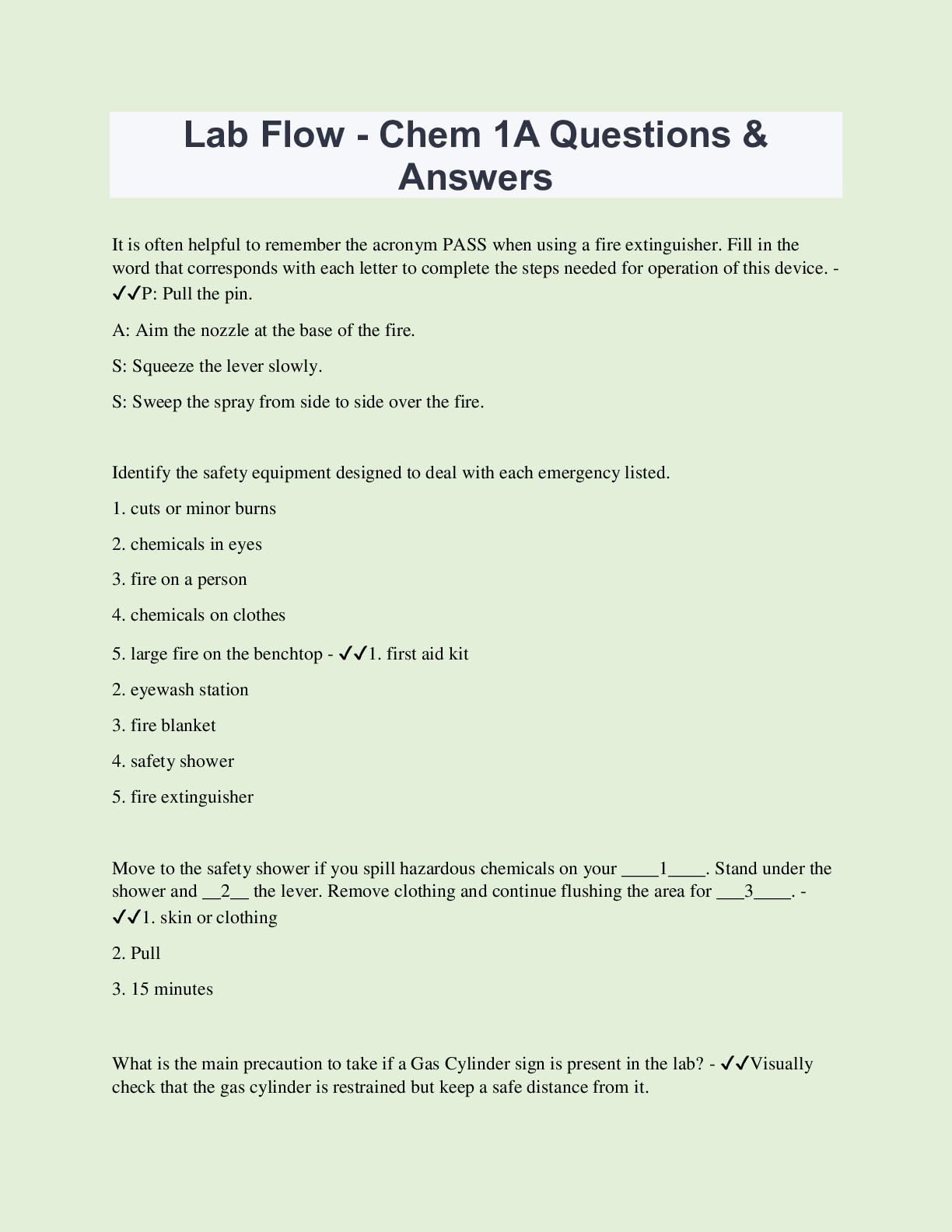 Chemistry > QUESTIONS & ANSWERS > Lab Flow - Chem 1A Questions & Answers | 150 Questions with 100% Correct Answers | Updated & Verified | 33 Pages (All)