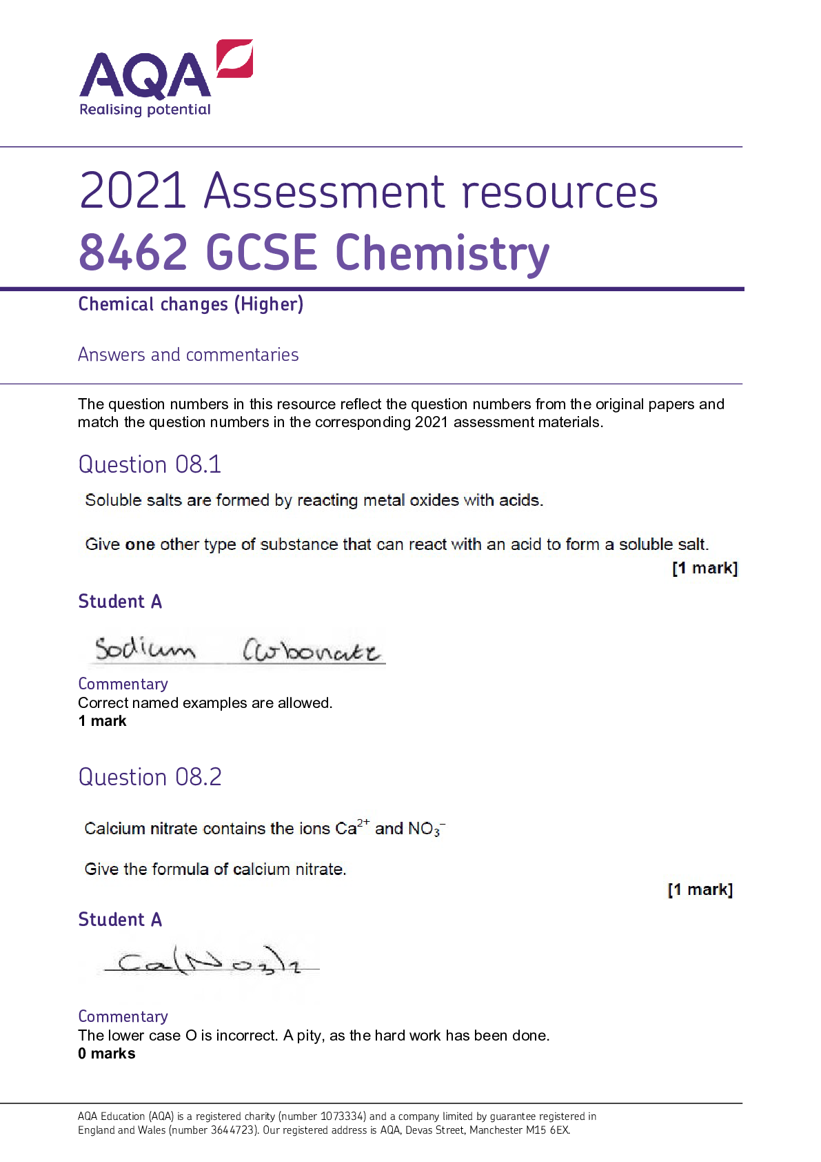 Chemistry > ANSWERS AND COMMENTARIES > AQA GCSE 8462 Chemistry Chemical changes (Higher) Answers and Commentaries. 2021 Assessment resources (All)