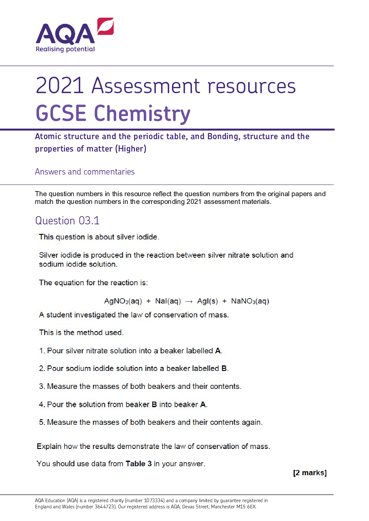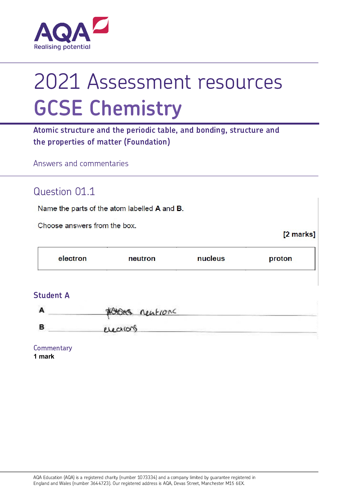 Chemistry > ANSWERS AND COMMENTARIES > AQA GCSE 8462 Chemistry Atomic structure and the periodic table, and bonding, structure and the properties of matter (Foundation) Answers and Commentaries. 2021 Assessment resources (All)