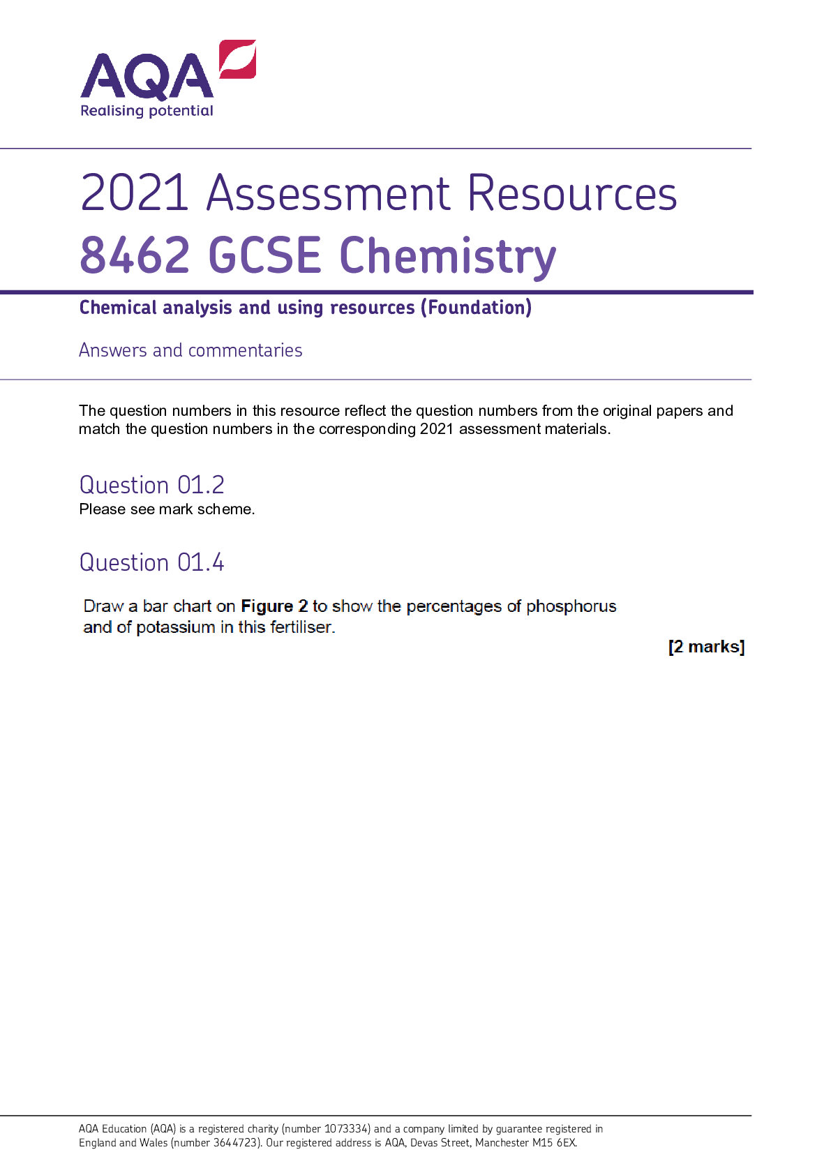 Chemistry > ANSWERS AND COMMENTARIES > AQA GCSE 8462 Chemistry Chemical analysis and using resources (Foundation) Answers and Commentaries. 2021 Assessment Resources (All)