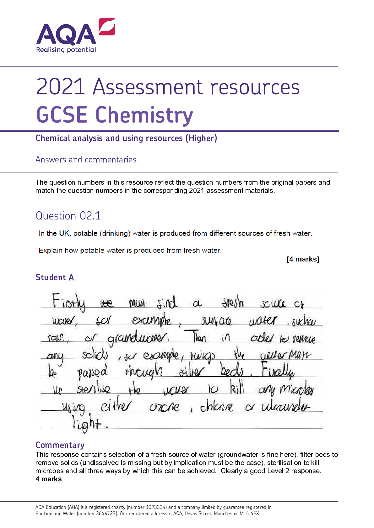 Chemistry > ANSWERS AND COMMENTARIES > AQA GCSE 8462 Chemistry Chemical analysis and using resources (Higher) Answers and Commentaries. 2021 Assessment resources. (All)