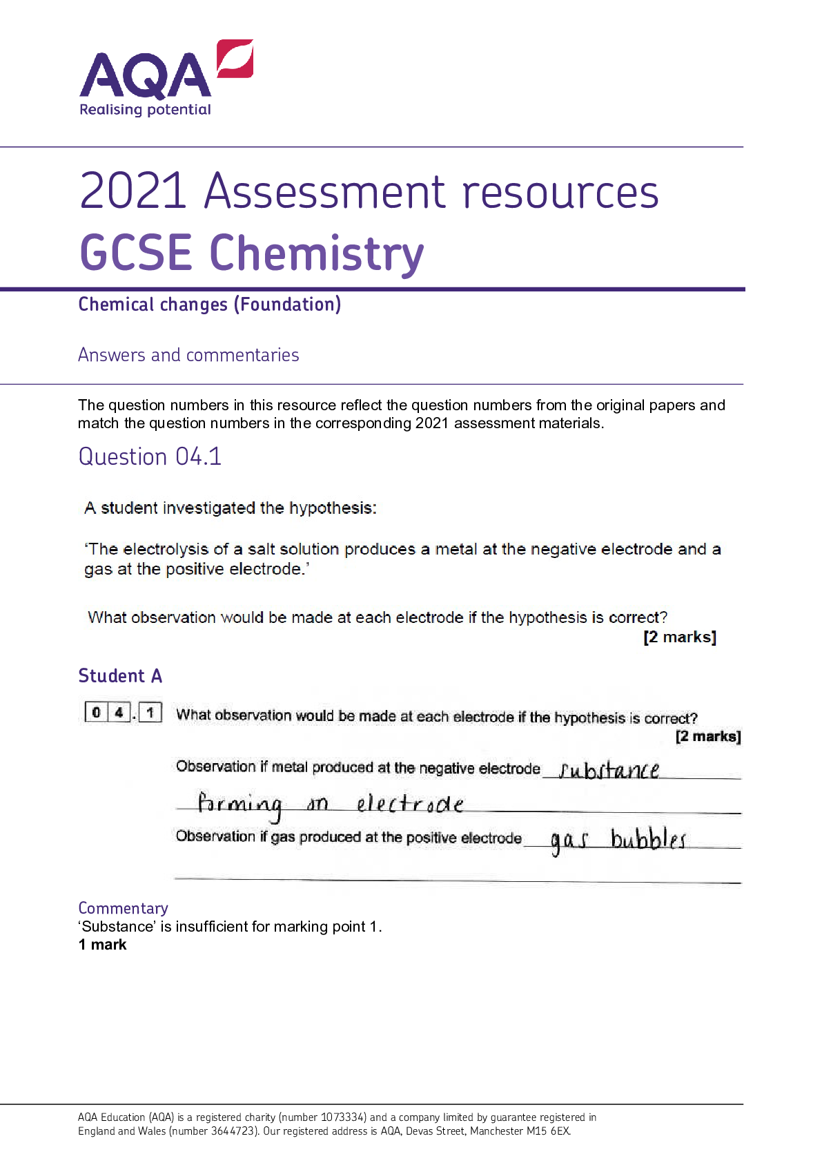 Chemistry > ANSWERS AND COMMENTARIES > AQA GCSE 8462 Chemistry Chemical changes (Foundation) Answers and Commentaries. 2021 Assessment resources. (All)