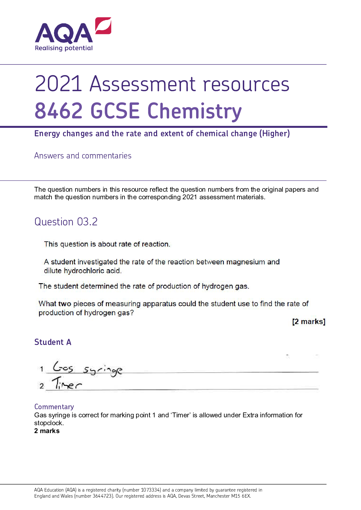Chemistry > ANSWERS AND COMMENTARIES > AQA GCSE 8462 Chemistry Energy changes and the rate and extent of chemical change (Higher) Answers and Commentaries. 2021 Assessment resources. (All)