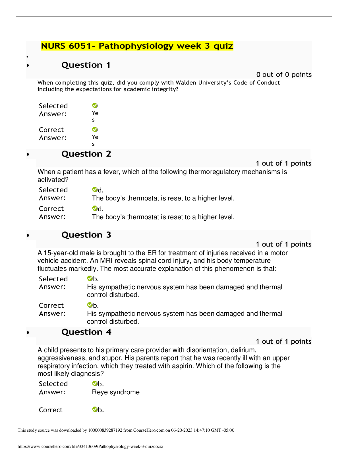 Pathophysiology > EXAM > NURS 6051- Pathophysiology week 3 quiz With complete Solution (Walden university) (All)