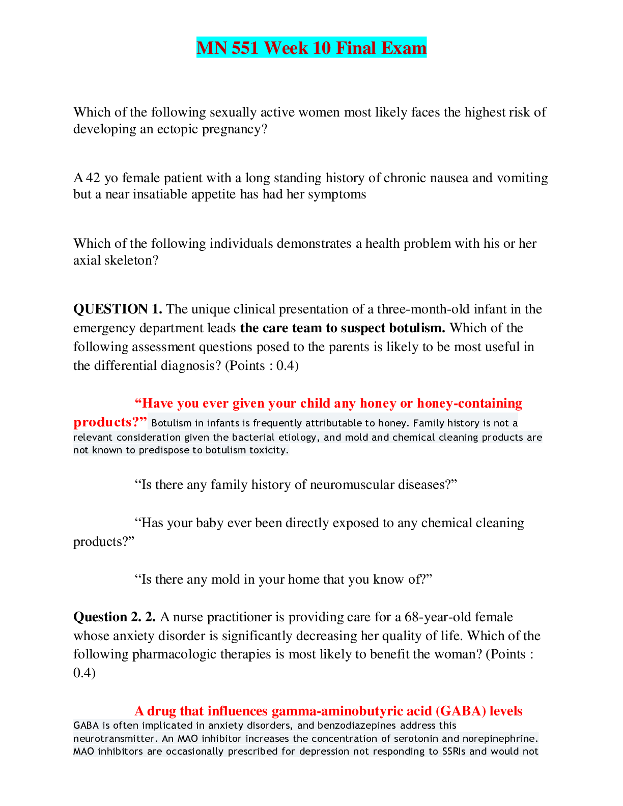 Pathophysiology > EXAM > MN 551 Week 10 Final Exam - Questions and Answers (All)