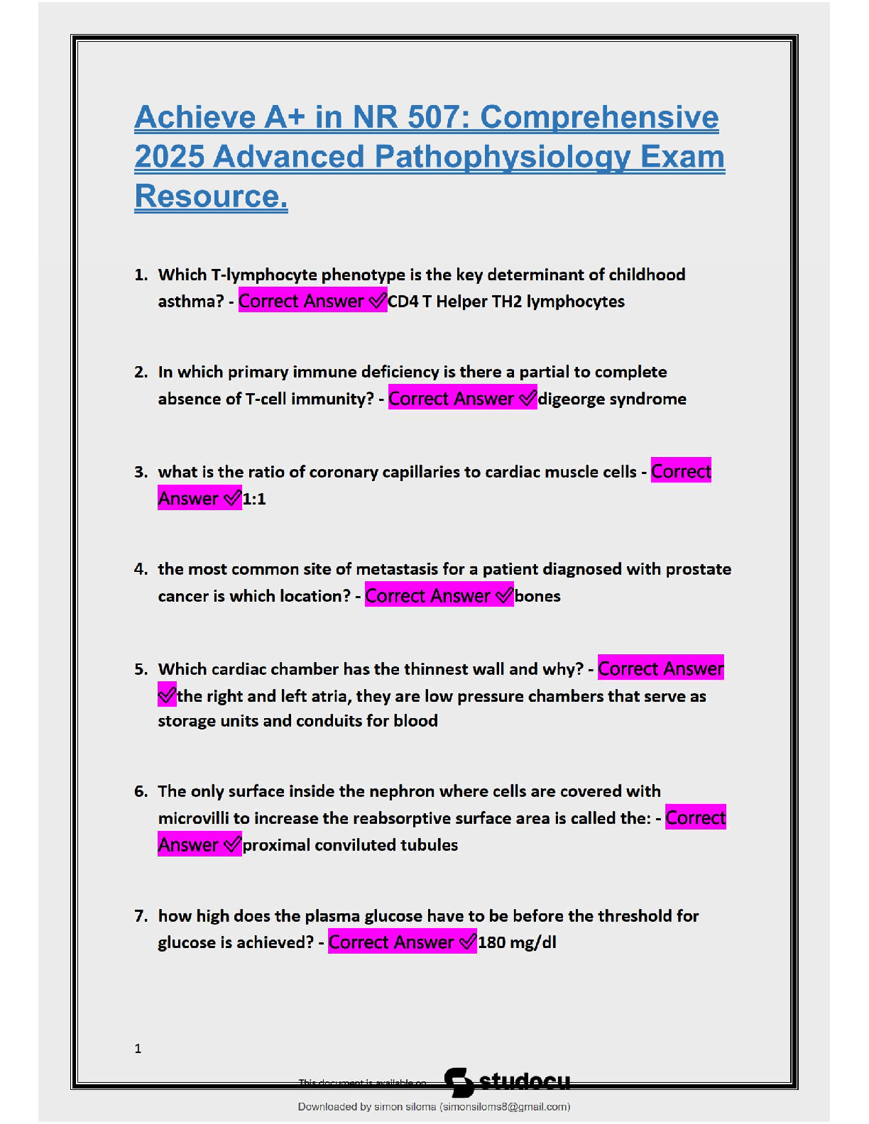 Pathophysiology > QUESTIONS & ANSWERS > NR 507 Comprehensive Advanced Pathophysiology Exam Guide / Achieve Study Notes + Practice Questions / 2025 Update (All)