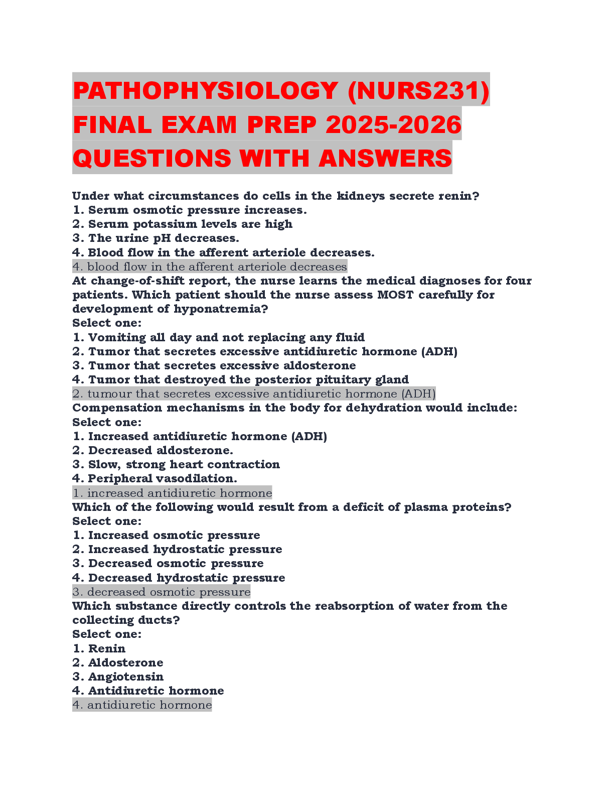 Pathophysiology > QUESTIONS & ANSWERS > PATHOPHYSIOLOGY (NURS231) FINAL EXAM PREP 2025-2026 QUESTIONS WITH ANSWERS (All)