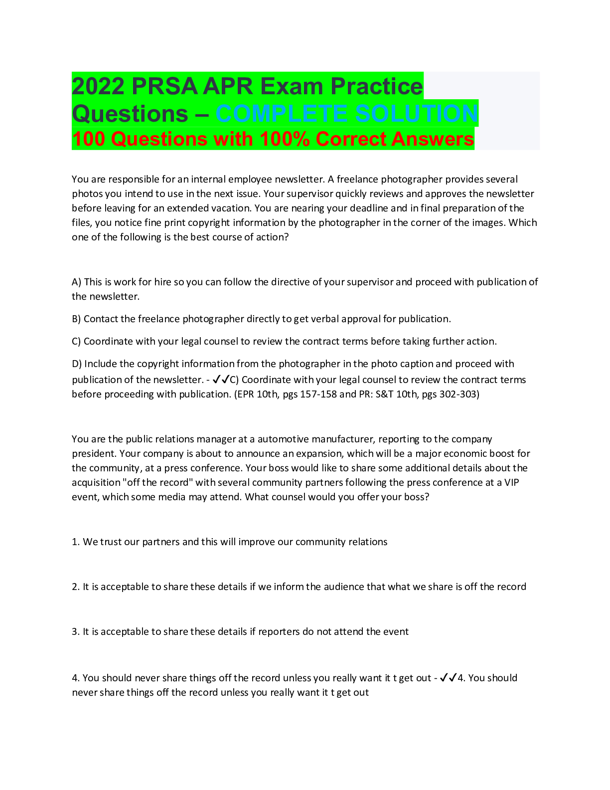 Pathophysiology > EXAMs > 2022 PRSA APR Exam Practice Questions – COMPLETE SOLUTION 100 Questions with 100% Correct Answers (All)